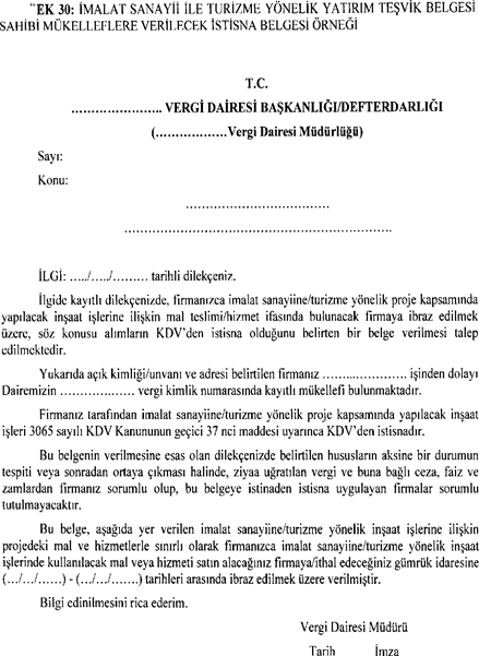 İstisnadan yararlanmak isteyen yatırım teşvik belgesi sahibi mükellefler, KDV yönünden bağlı oldukları vergi dairesine istisna belgesi almak için başvuruda bulunurlar. Başvuruda bulunan mükellefler tarafından inşaat işlerine ilişkin istisna kapsamında alınacak mal ve hizmet listesi, hazırlanan projeye uygun olarak elektronik ortamda sisteme girilir. Vergi dairesince gerekli kontroller yapıldıktan sonra şartları sağlayanlara elektronik olarak sisteme girilen mal ve hizmetle sınırlı olmak üzere istisna belgesi verilir (EK:30).